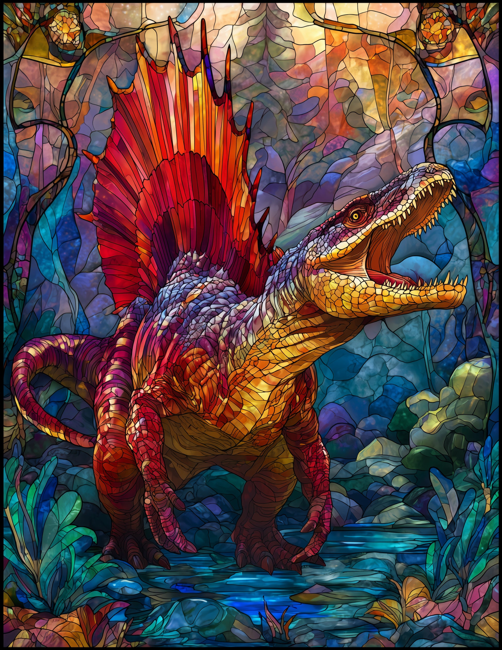 Bring the beauty of spinosaurus stained glass art into your home with this digital wall print, featuring subtle color variation and refined detail.